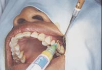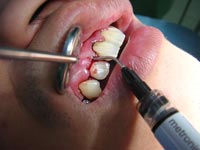 | After scaling and root planing, the operation area is isolated with cotton rolls. Ties metronidazole gel is applied with put the tip of needle into pocket with 2mm depth, and applied it until the gel come out from marginal gingival. Clean the gel in marginal gingival with cotton. |