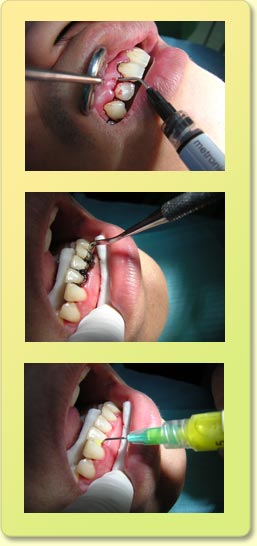 Application is done after scaling root planing (SRP). Isolate the operation area with cotton rolls. Put the tip of needle into depth, of 3 mm in the pocket and apply the gel until comes out of the marginal. Clean marginal gingiva with cotton after the application. Reapplication can be done on the 7th day. The pocket examination will be done after 1 month.